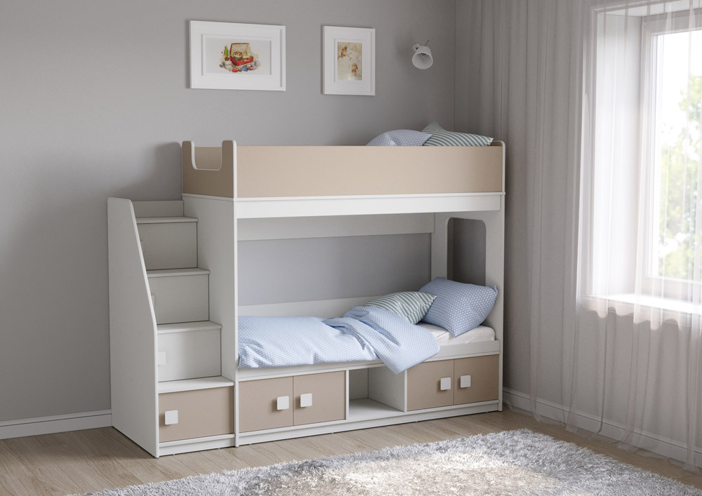 Классическая детская двухъярусная кровать с двумя параллельными спальными местами размером 1750х750 и 1900х750, закрытыми местами хранения и угловой лестницей-стеллажем.