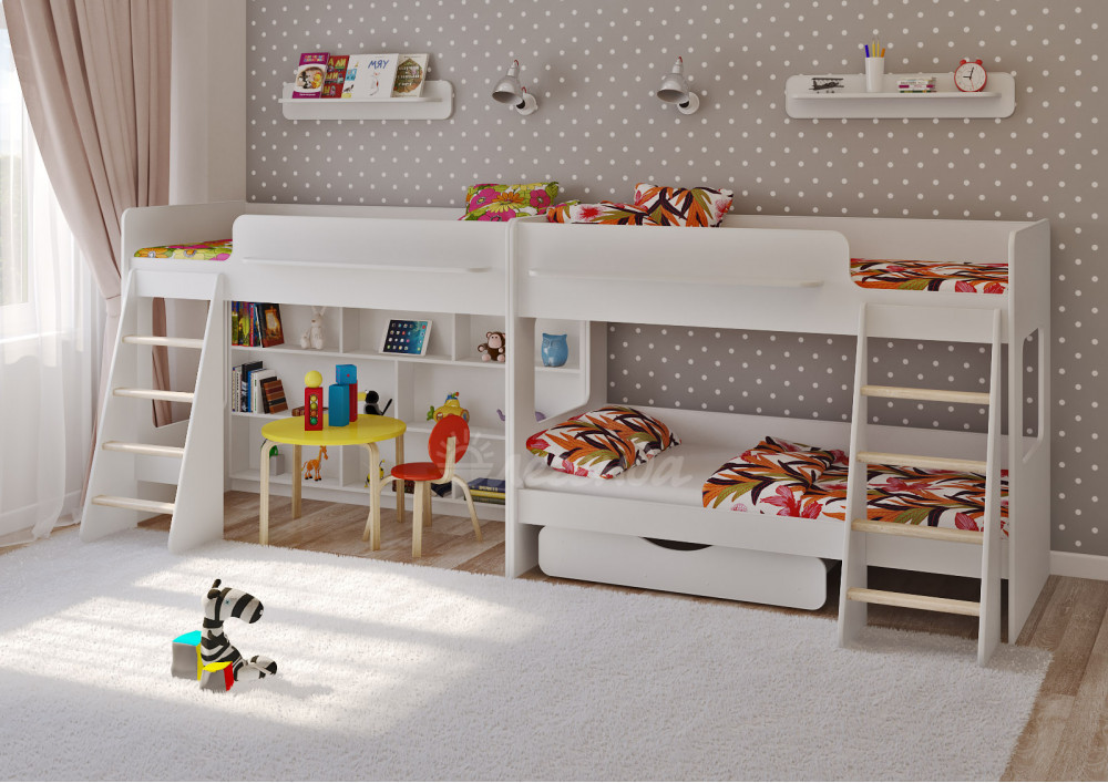Две удобные белые полки Л-01 над каждой кроватью обеспечат Вашим детям удобное хранение мелочей.